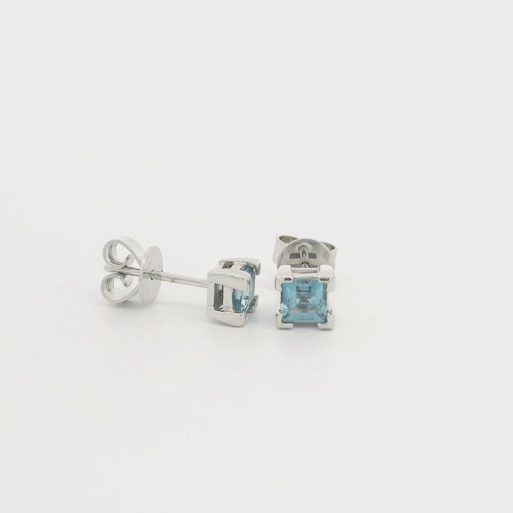 Pair 18ct white gold Aquamarine stud earrings. The earrings consist of 2 = 0.57ct square aquamarine stones set into 4 corner claw earring setting with post and heavy butterflies. Total earrings weight 1.9 grams