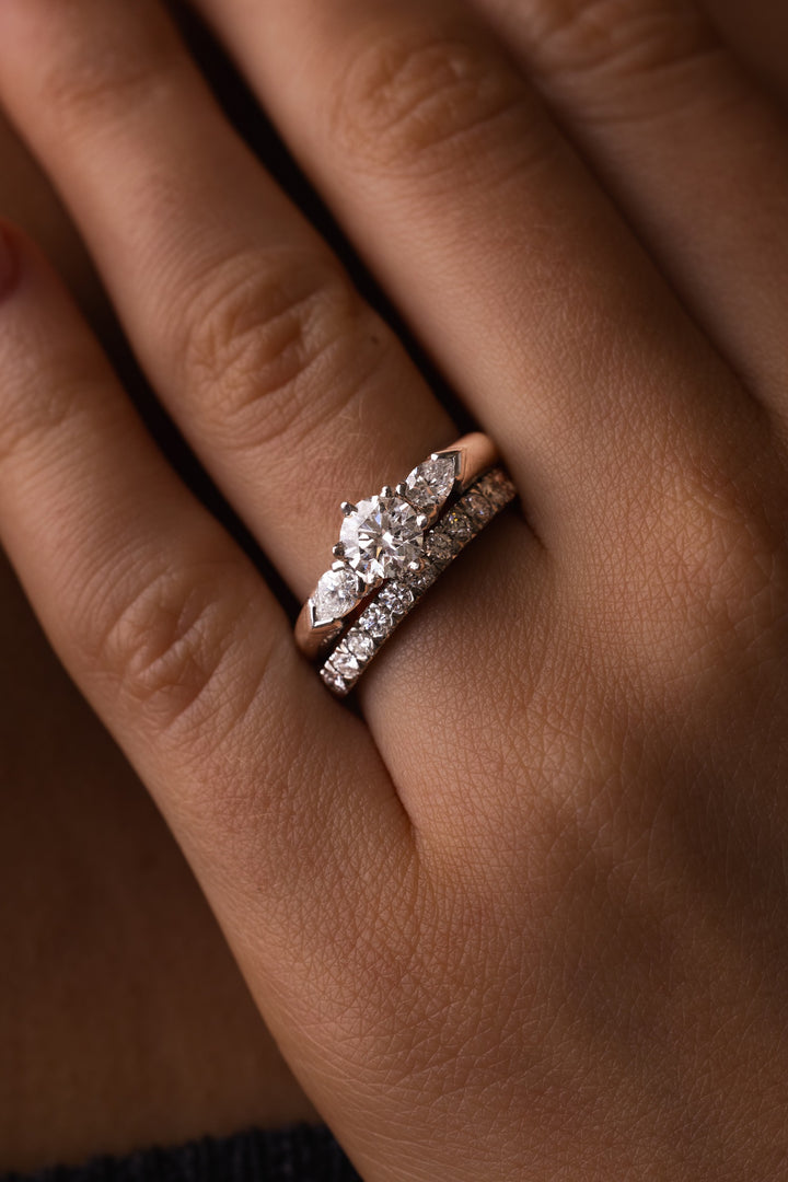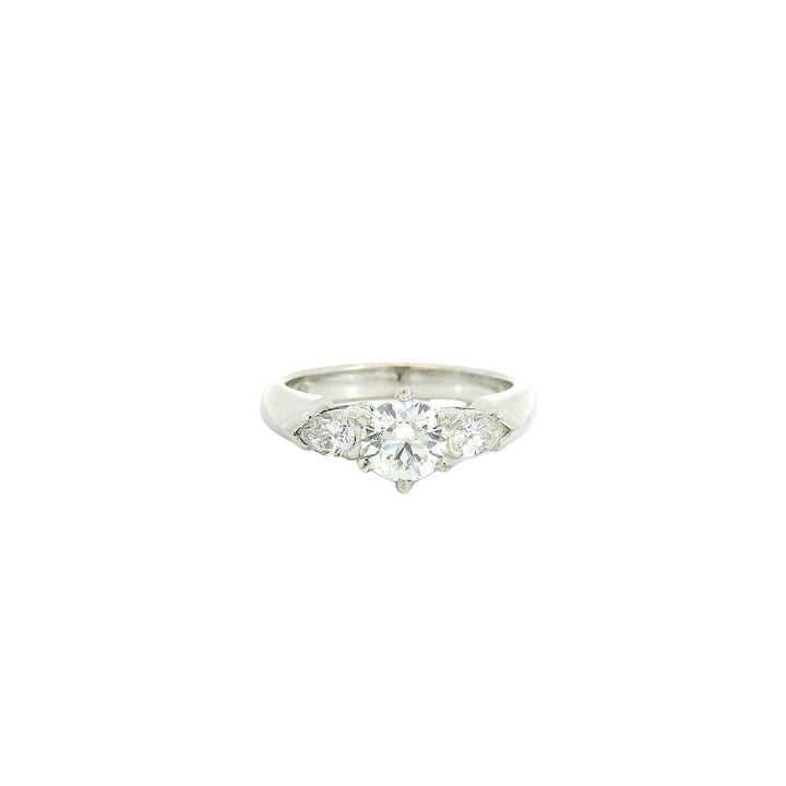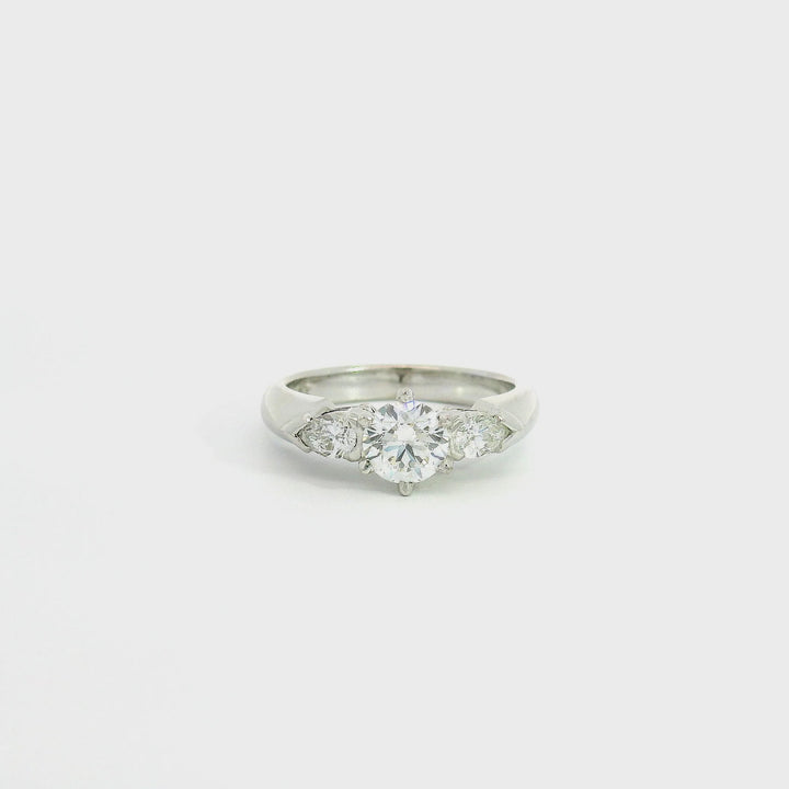 A dreamy three stone engagement ring sits high on every girl’s wish-list. Make her dreams come true with this 18ct white gold handmade engagement ring, centrally set with a 0.72ct round brilliant cut diamond, and two side pear shaped diamonds, weighing a total of 0.32ct.