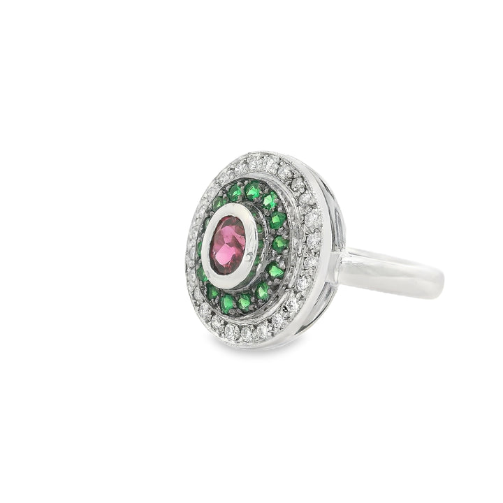 18ct white gold handmade pink sapphire, tsavorite garnet & diamond halo ring. The ring consists of 1 oval cut pink sapphire = 0.55ct set into a rub over setting. 14=0.26ct tsavorite garnets grain set. 24 =0.24ct F/SI rbc diamonds grain set. Finger size N1/2. Total ring weight 7.3 grams