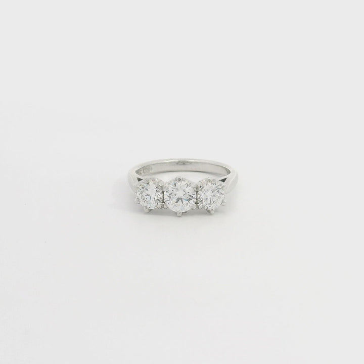 18ct white gold trilogy diamond ring. The ring consist of 1=0.60ct F/SI2 (GIA #6391053519) round brilliant cut diamond, set into the centre, on either side of the central diamond are 2=0.80ct F/SI2 (GIA #6365866745 & #1216356957 ) round brilliant cut diamonds. All diamonds are set into 6 claw setting.
