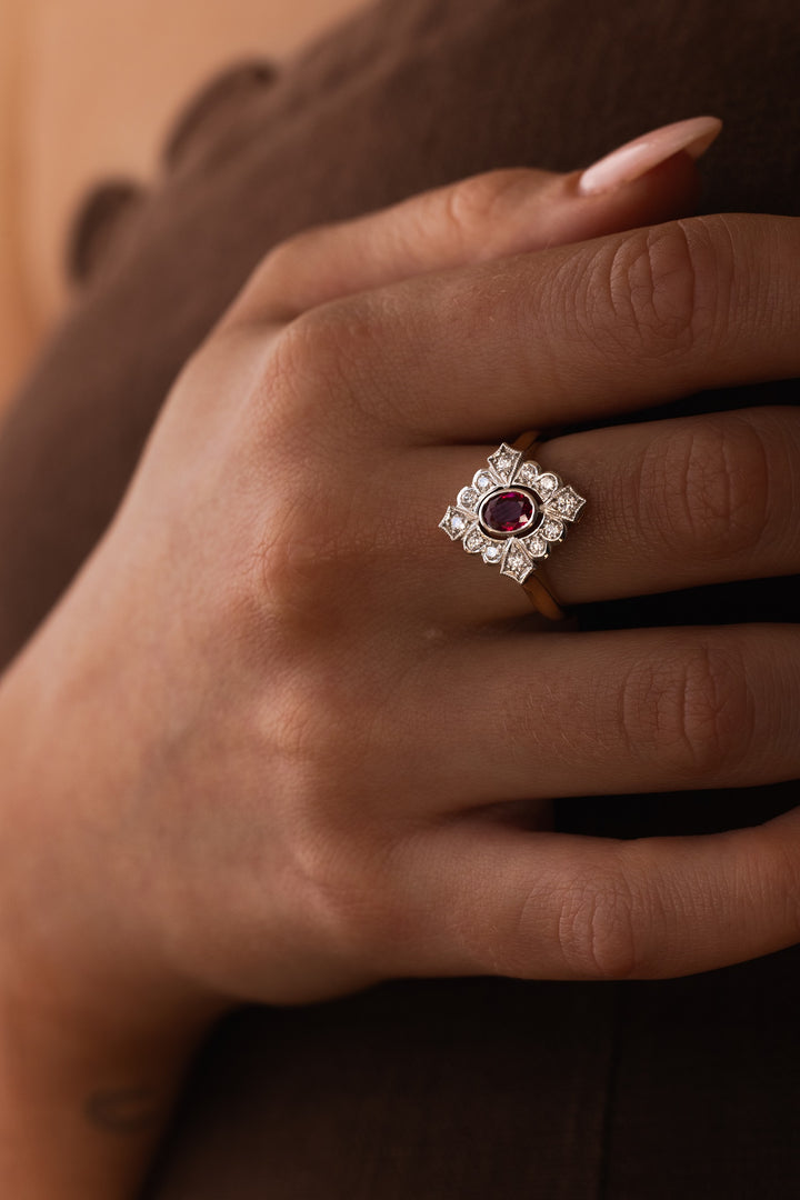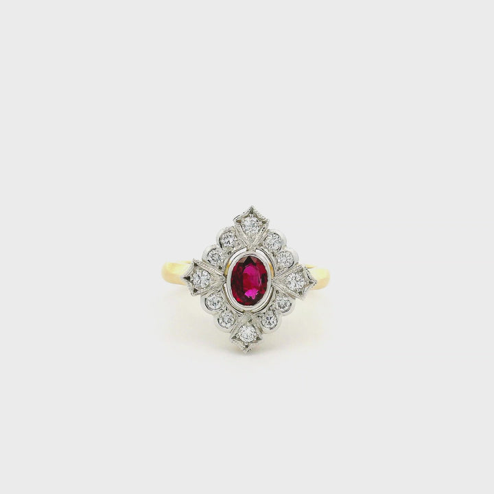 This stunning ruby and diamond ring was inspired by the Art Deco movement, featuring a unique design and centrally set with an oval shaped red ruby weighing 0.50ct. This 18ct yellow and white gold ring is sure to be a statement for any occasion.