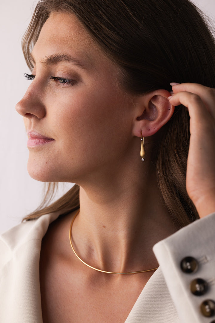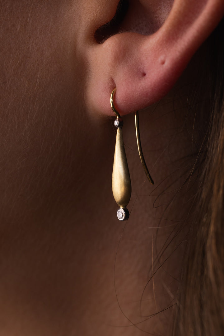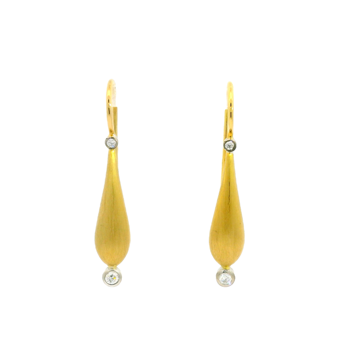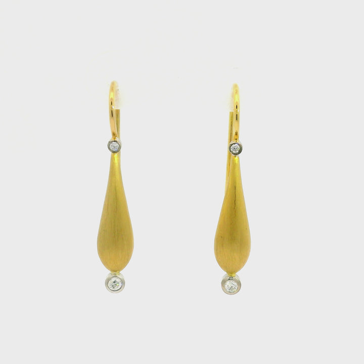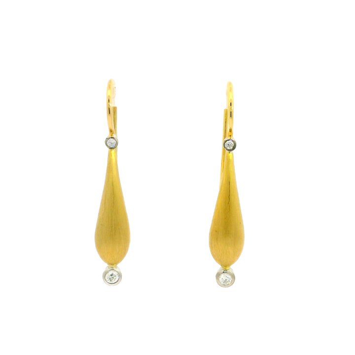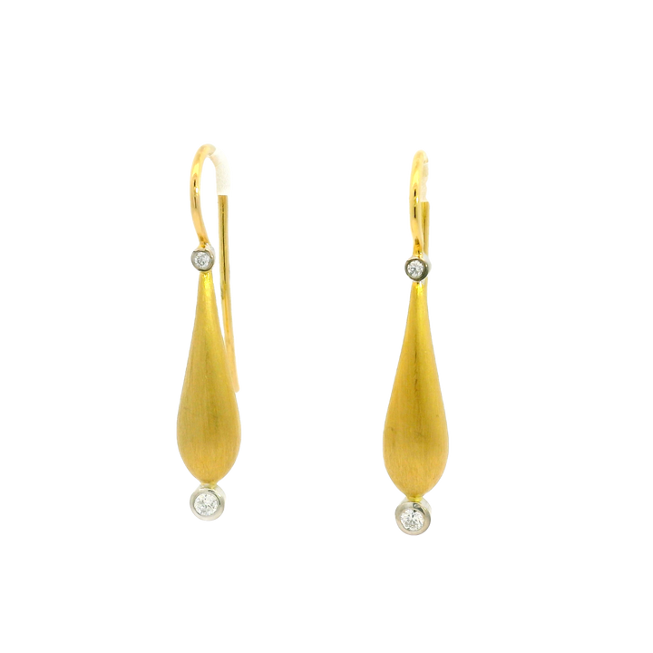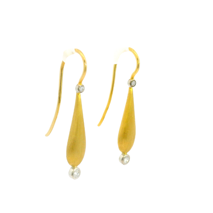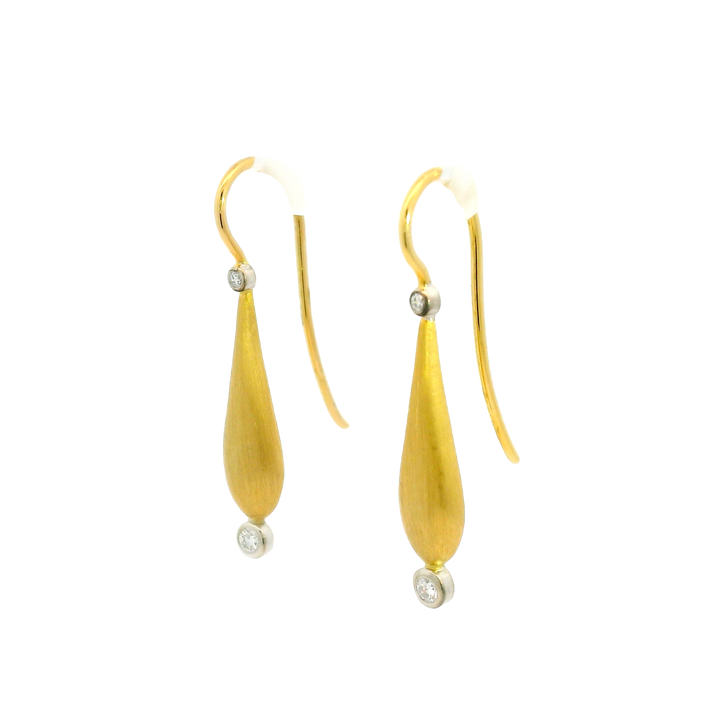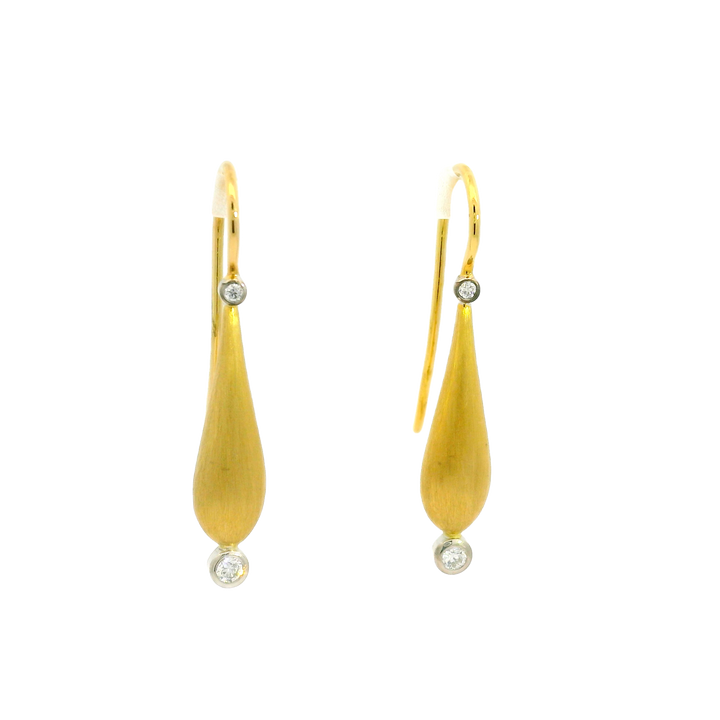 Handmade in our Milton based workshop, these 18ct yellow and white gold diamond drop earrings are simplistic yet elegant. Featuring a brushed teardrop shape and set with 4=0.08ct FG/VS-SI round brilliant cut diamonds.