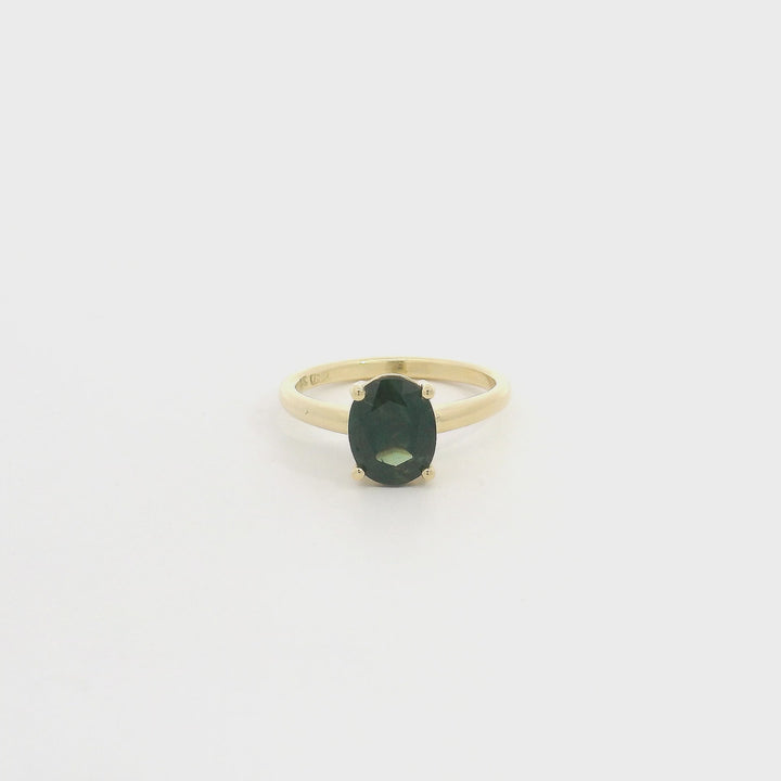 Handmade 18ct yellow gold 2.10ct green/blue oval parti sapphire. The sapphire is set into a 4 claw setting.