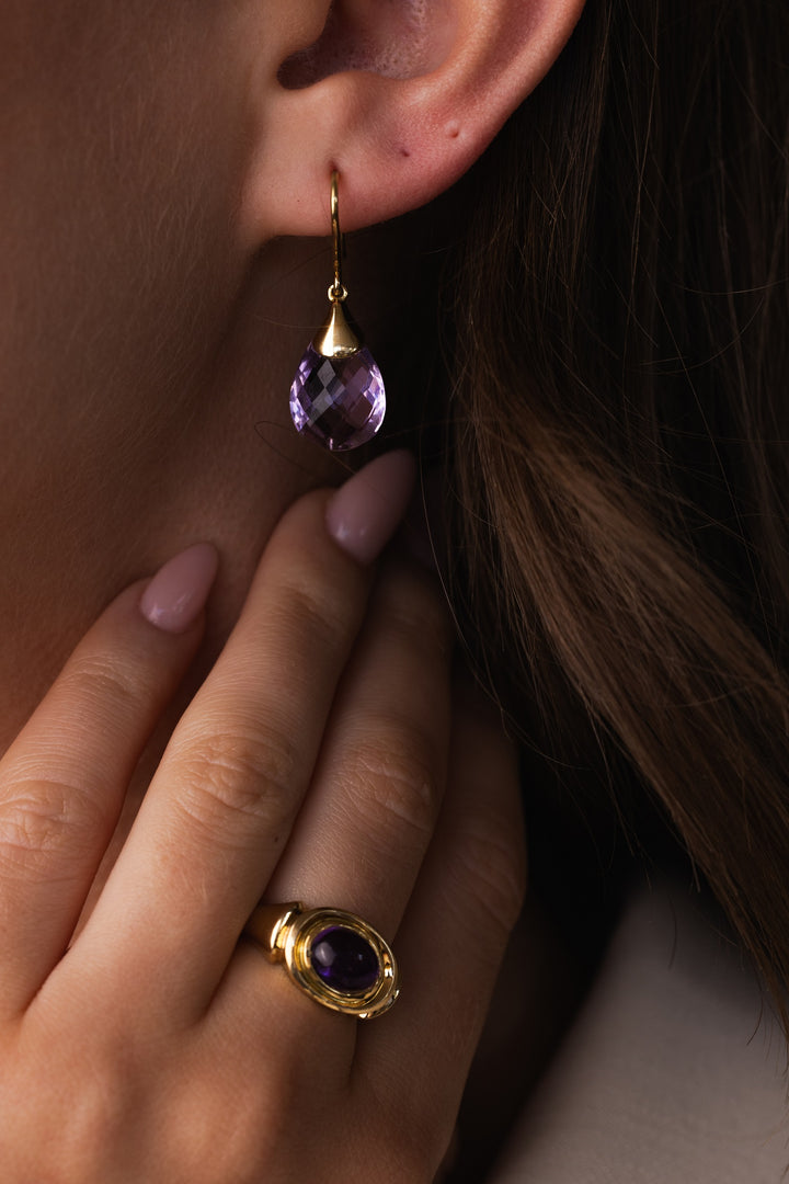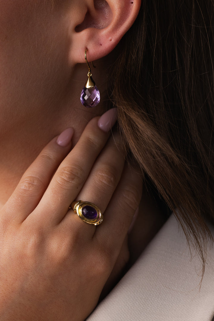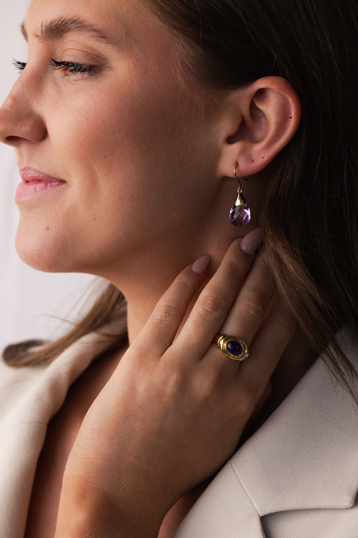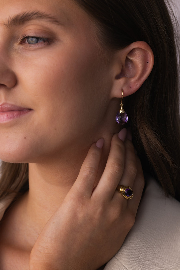Classy and sophisticated, find this handmade 18ct yellow gold dress ring on display in our Milton based boutique store. Designed, crafted, and lovingly set with a vibrant purple Amethyst, measuring 9.2x6.9mm. Take it home today!
