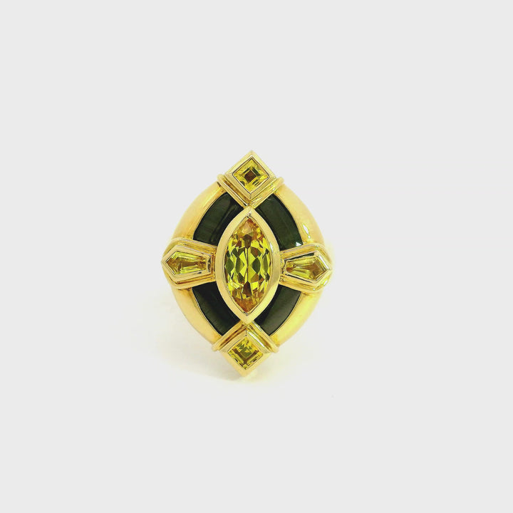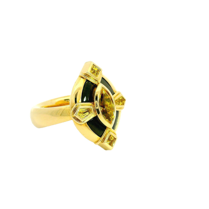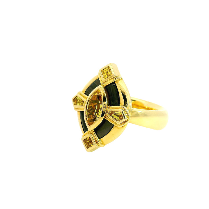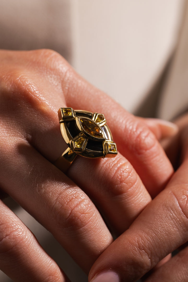 A National Finalist in the Australian Jewellery Design Awards, as part of the Jewellers Association of Australia (JAA), Craig McKim designed and handmade this Australian sapphire ring. Centrally set with a 1.28ct marquise cut yellow sapphire and surrounded by uniquely cut yellow sapphires and black star sapphires. This 18ct yellow gold ring is sure to be the hero of any outfit.