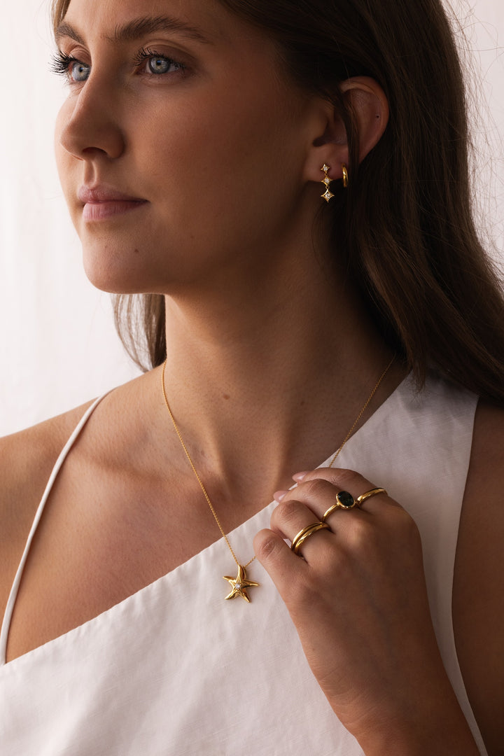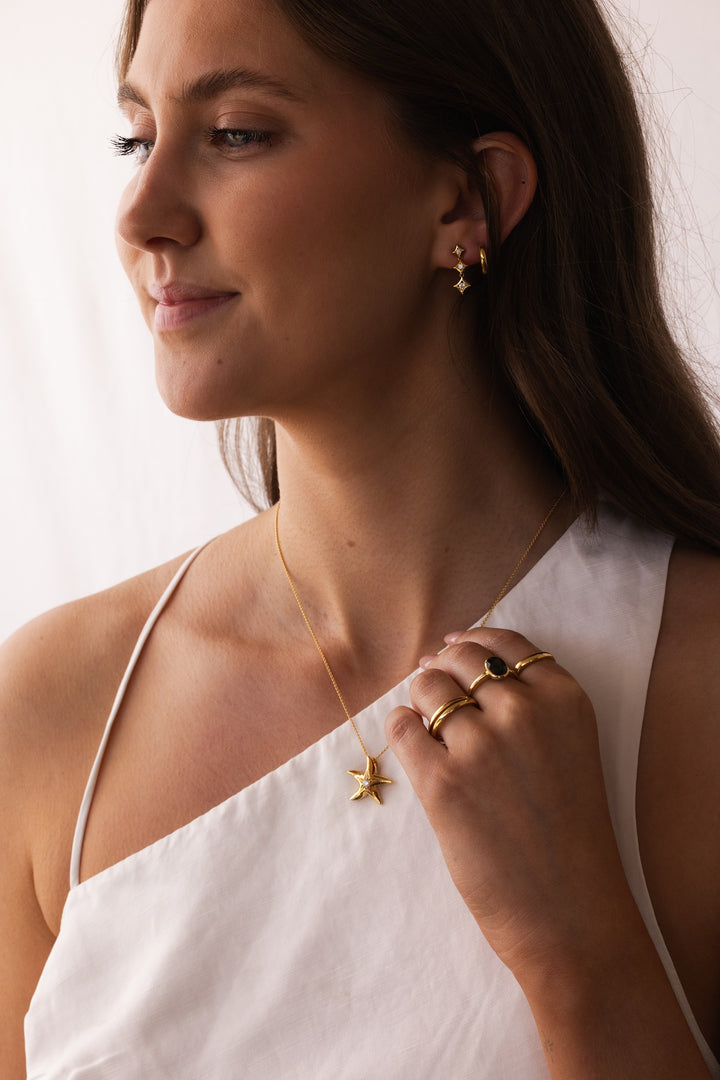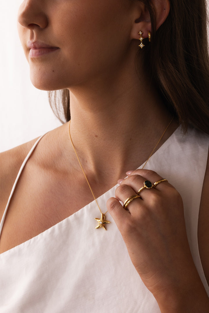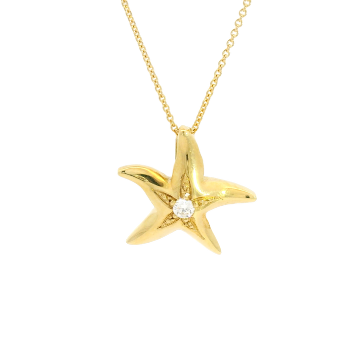Memories of hot summer days and rockpools come rushing in with this 18ct yellow gold starfish pendant. Handmade in our on-site workshop and grain set with 1=0.09ct FG/VS-SI round brilliant cut diamond.