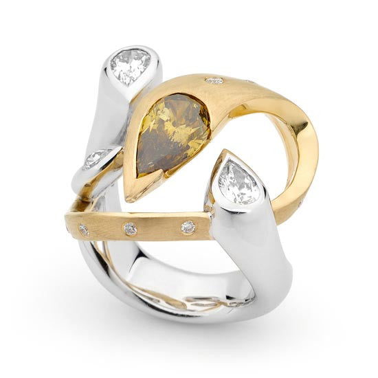 This award finalist ring features yellow and white pear shaped diamonds set in 18ct yellow and white gold.