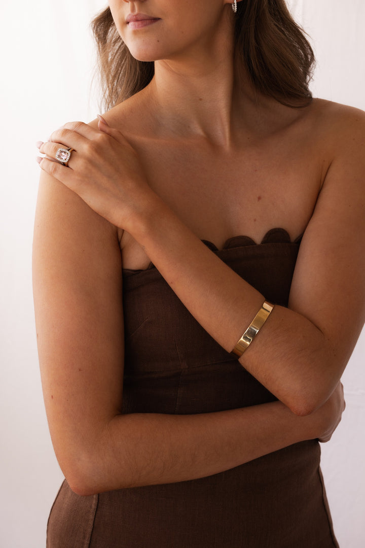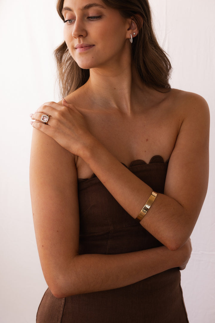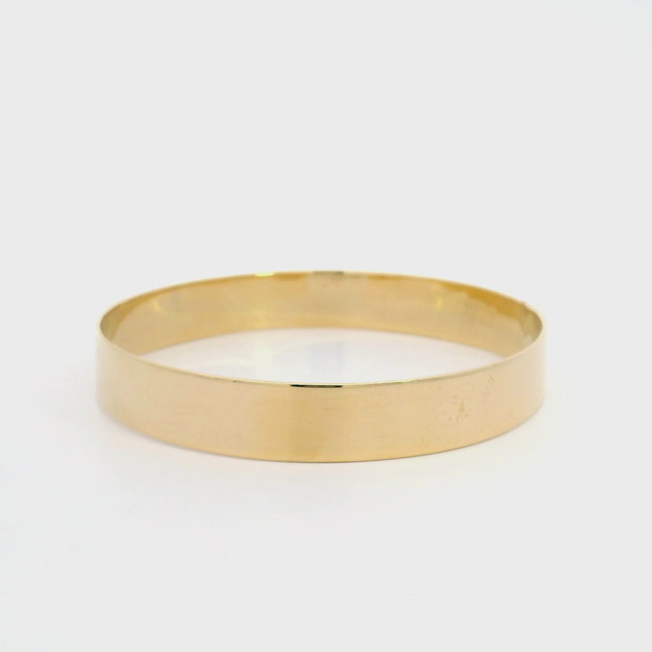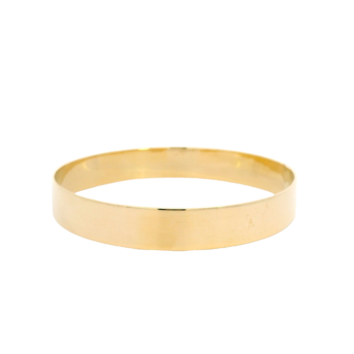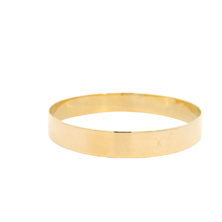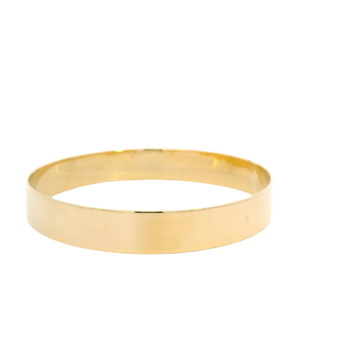 Classy, sophisticated, chic. This statement 9ct yellow gold bangle will dress up any outfit. Handmade with precision, this bangle features a flat profile and is finished with a high polish, measuring 11.2mm wide.