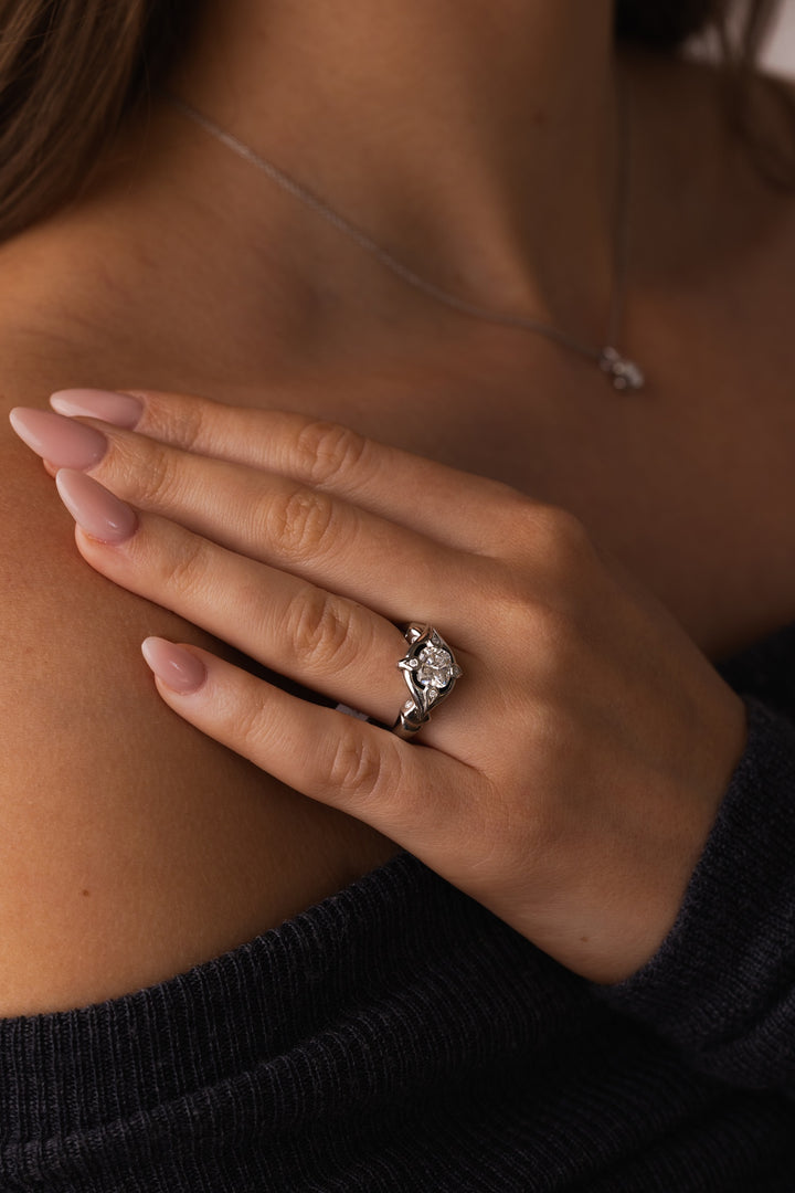 Expressing uniqueness and individuality, this handmade platinum engagement ring will be the center of attention on any occasion. Centrally set with a certified 1.24ct cushion cut diamond, F in colour and VS in clarity. This stunning diamond is surrounded by black enamel, helping to make the diamond ‘pop’.