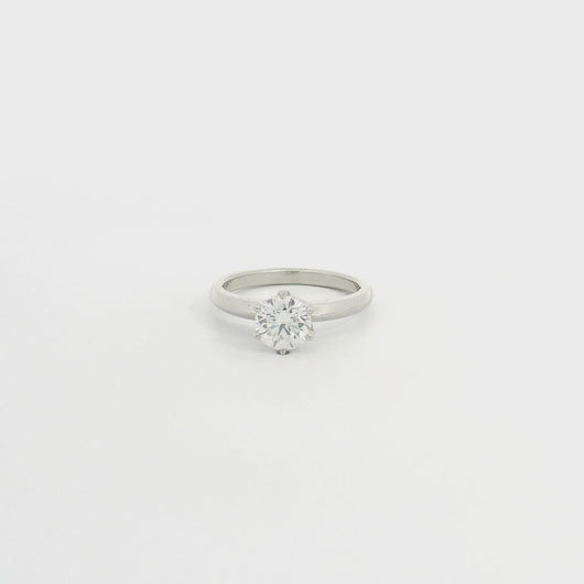Handmade platinum solitare diamond ring. The ring consists of 1 = 1.01ct G/VS2 (GIA #1368471138) round brilliant cut diamond. The diamond is set into a 6 claw setting. The ring features knife edge shank. The ring is designed to sit along a straight wedding band.
